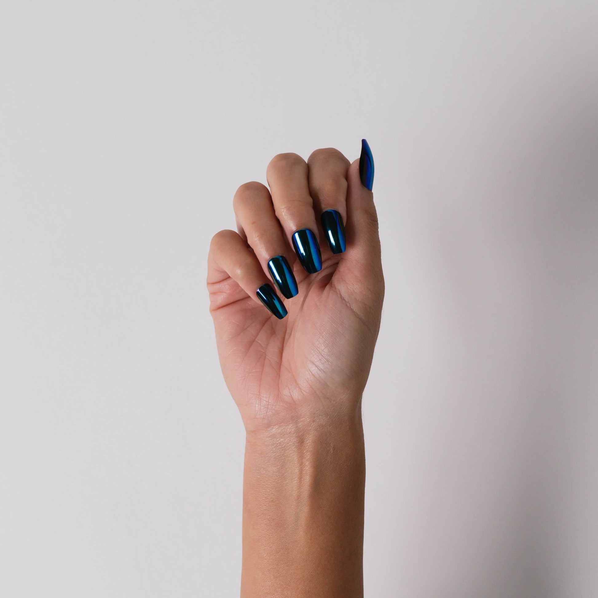 These amazing blue chrome nails are complete SHOWSTOPPERS! They are so bold and daring that it is no question everyone’s eyes will be on you. After all, these blue chrome press-on nails deserve all the attention. If you’re a lover of long coffin nails and making bold beauty statements, look no further for your perfect nail set. These chrome acrylic nails will be the life of any party!